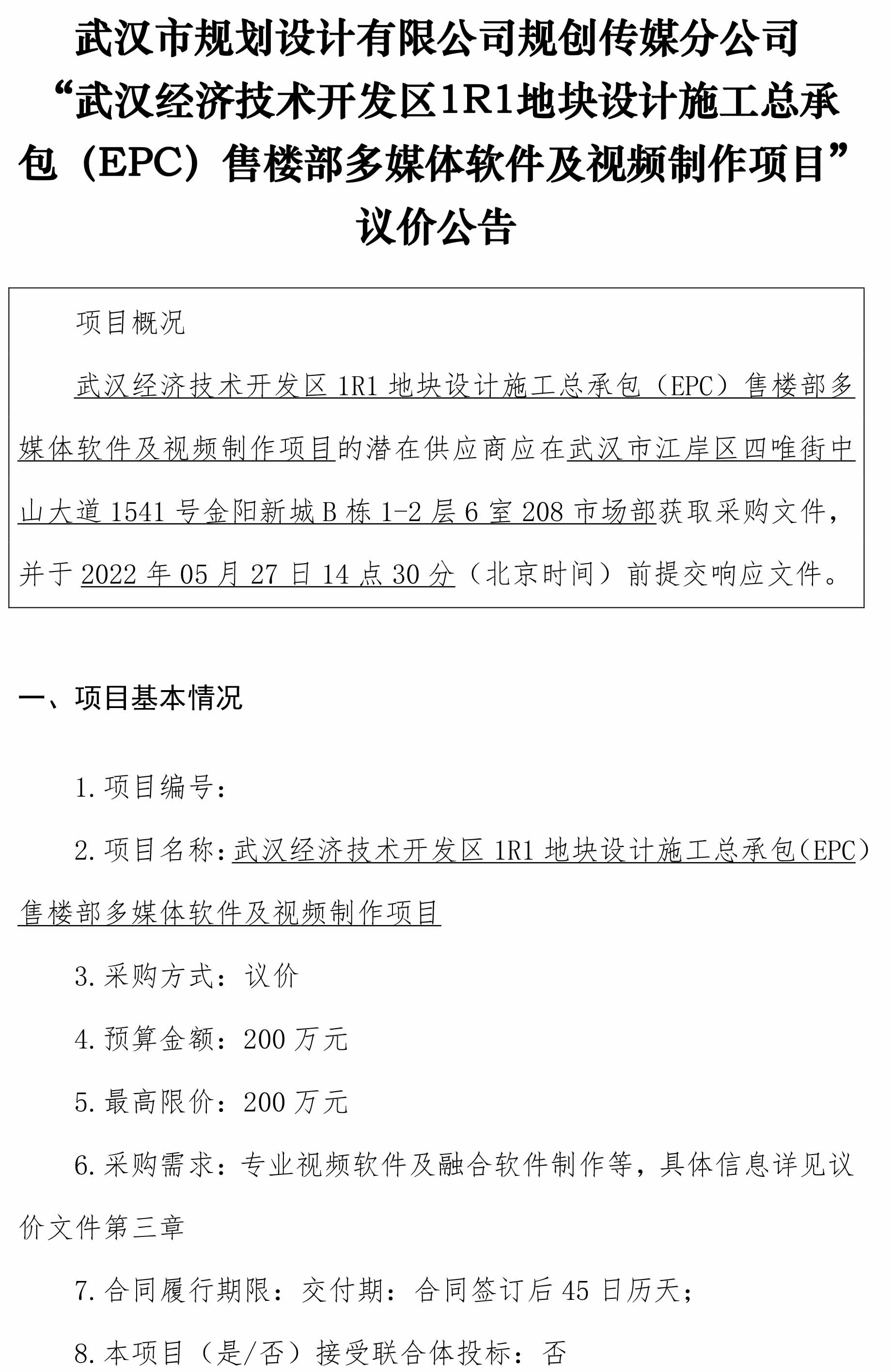 武汉市规划设计有限公司规创传媒分公司“武汉经济技术开发区1R1地块设计施工总承包(EPC)售楼部多媒体软件及视频制作项目”议价公告